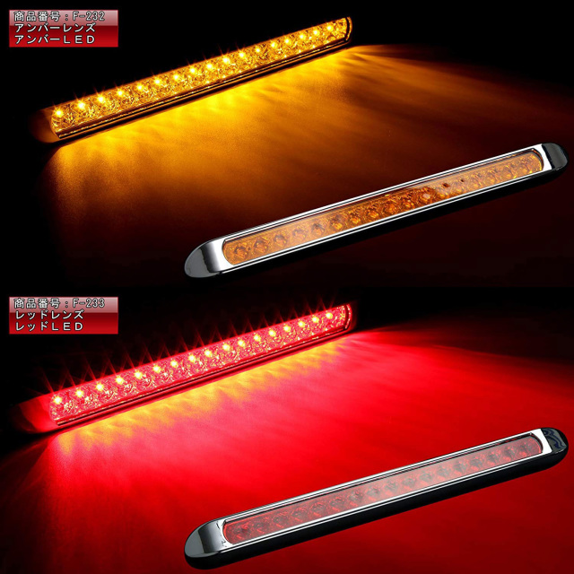 配線の使い分けで暗点灯、明点灯の2段階発光モードを全カラーに搭載。ブレーキやウインカーと連動もOK。