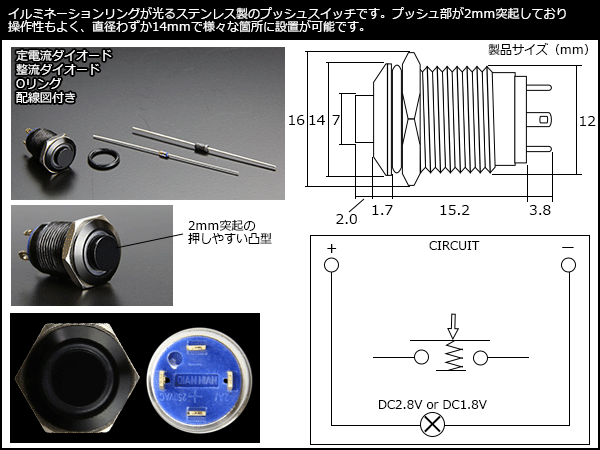 LEDイルミネーションリング付きのプッシュ式スイッチ