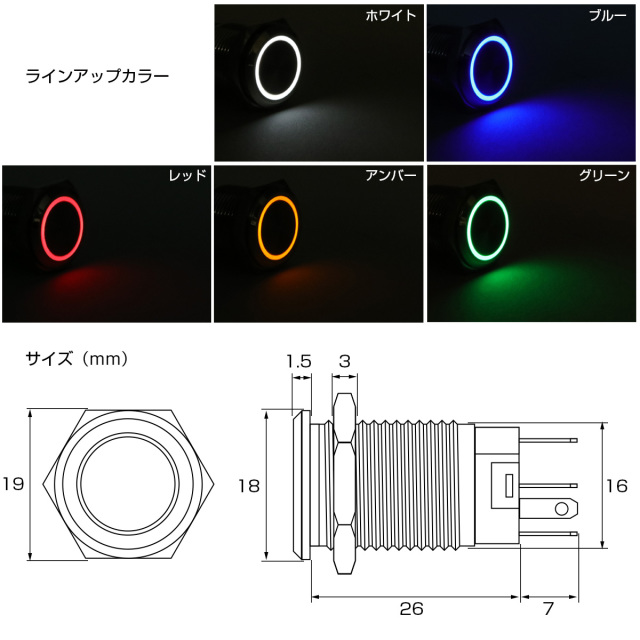 配線方法により常時点灯・スイッチONで電装品の動作と合わせてイルミ点灯の使い分けができるLEDリング搭載。