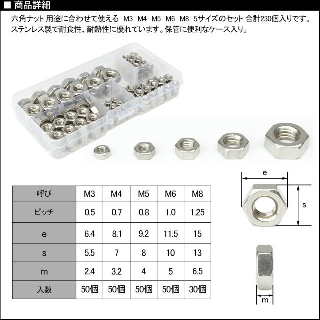 用途に合わせて使える M3 M4 M5 M6 M8 5サイズのセット 合計230個入りです。
