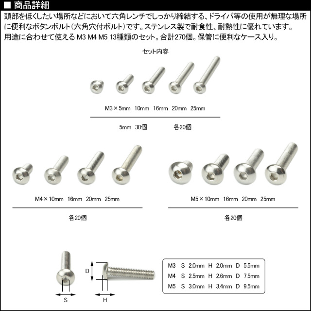 | ■セット内容 ・M3×5mm 30個 | ・M3×10mm 20個 | ・M3×16mm 20個 | ・M3×20mm 20個 ・M3×25mm 20個 ・M4×10mm 20個 | ・M4×16mm 20個 | ・M4×20mm 20個 | ・M4×25mm 20個 ・M5×10mm 20個 | ・M5×16mm 20個 | ・M5×20mm 20個 | ・M5×25mm 20個 |