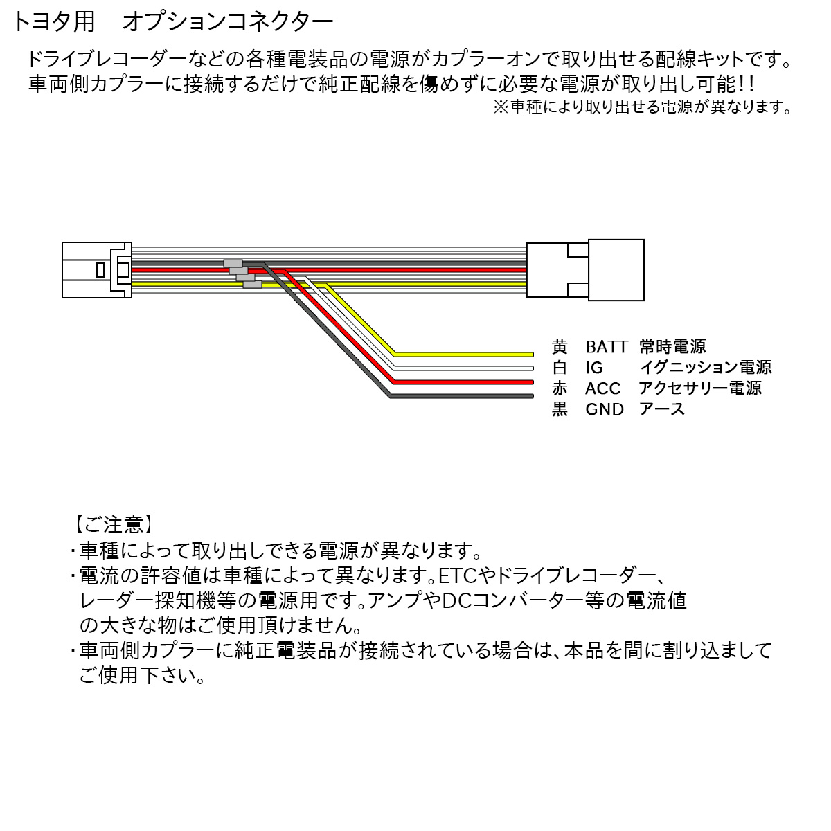 ドライブレコーダーなどの各種電装品の電源がカプラーオンで取り出せる配線キットです。