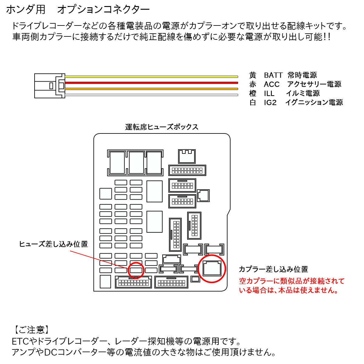 ドライブレコーダーなどの各種電装品の電源がカプラーオンで取り出せる配線キットです。