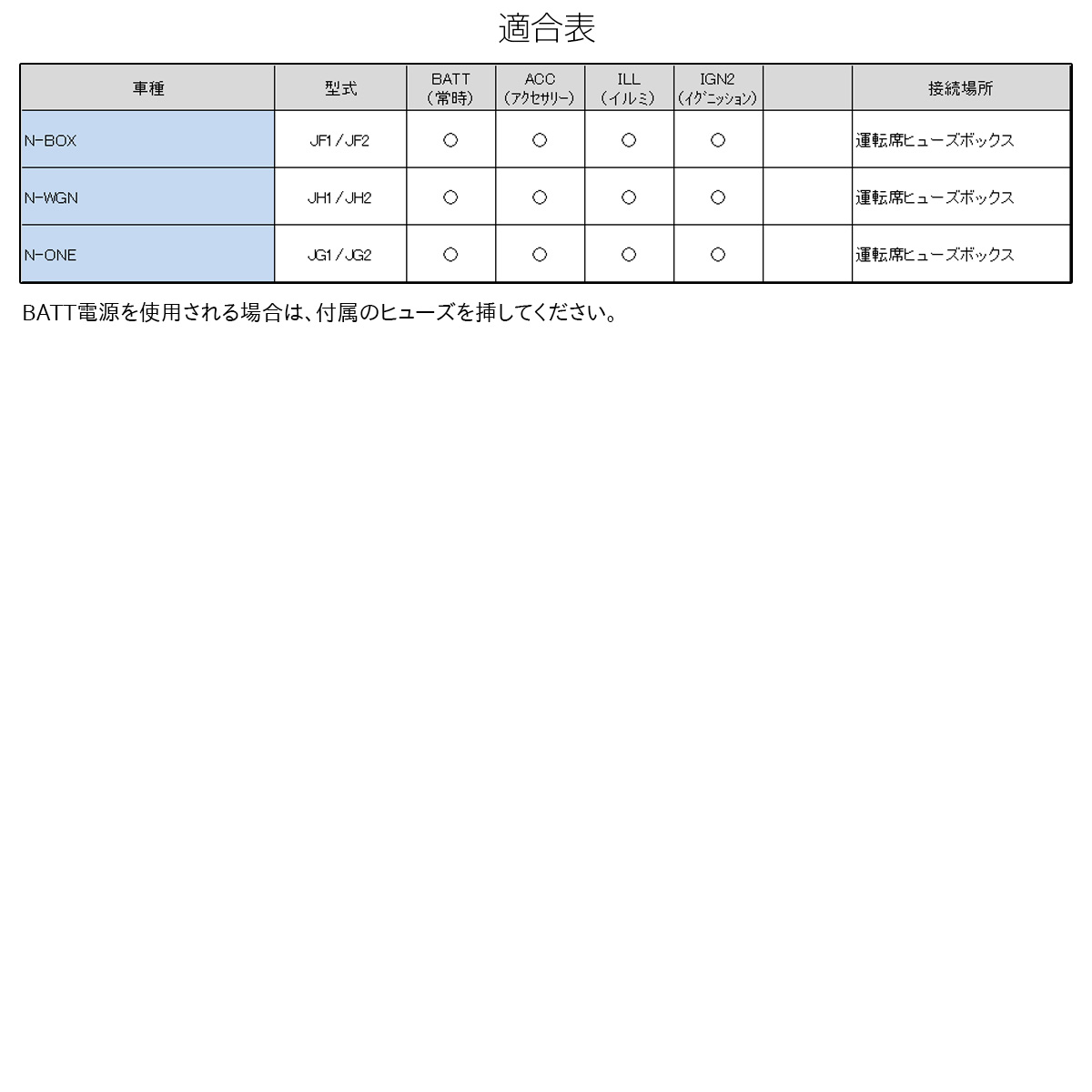 | ■適合車種 ・N-BOX JF1 / JF2 ・N-WGN JH1 / JH2 ・N-ONE JG1 / JG2 |