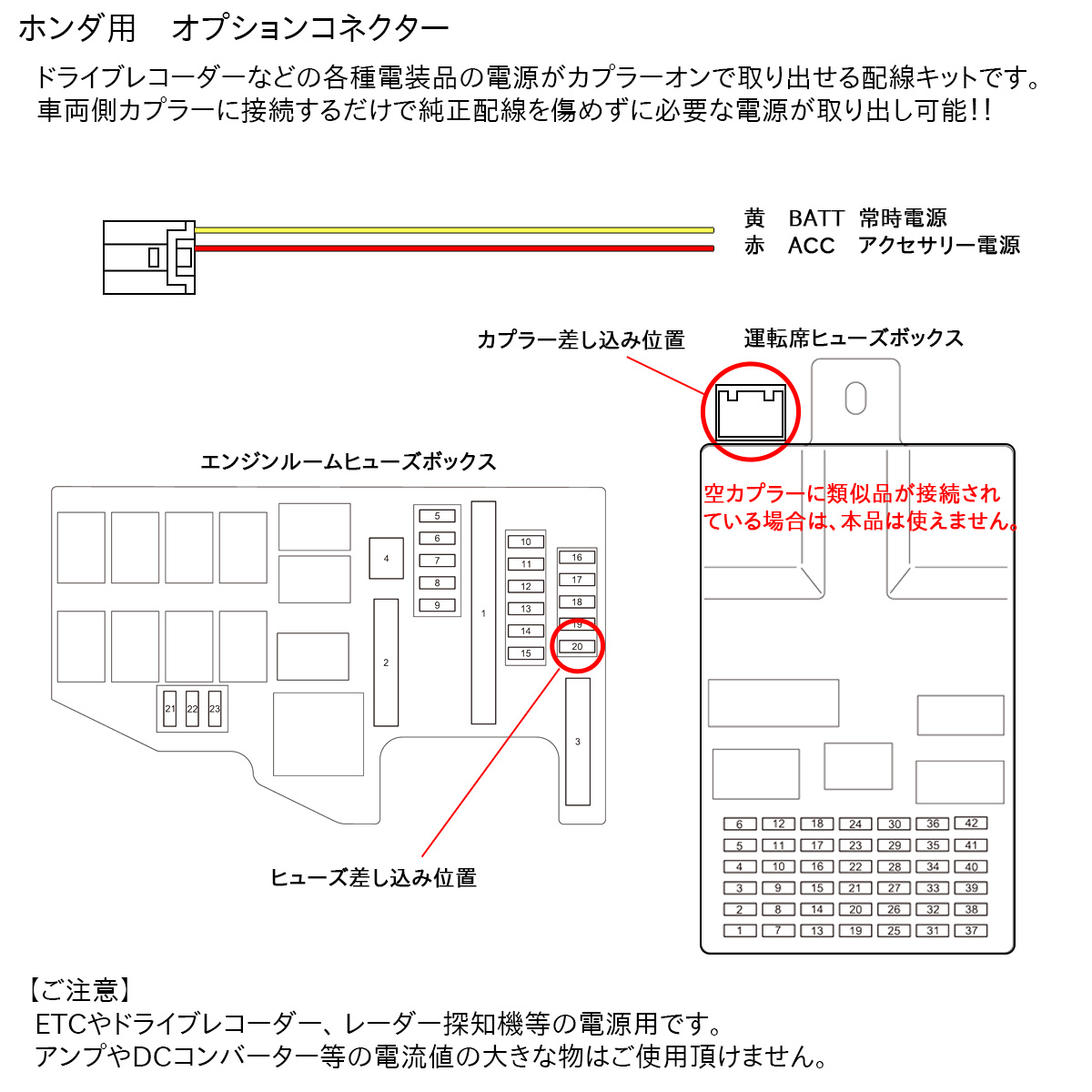 ドライブレコーダーなどの各種電装品の電源がカプラーオンで取り出せる配線キットです。