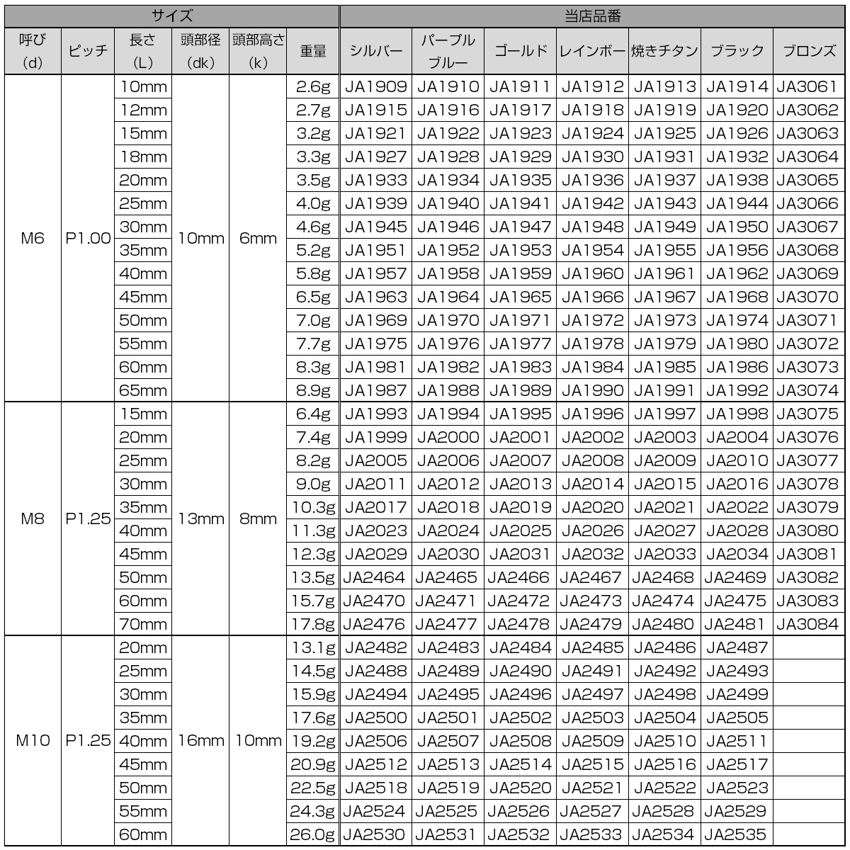 | ※記載のサイズ・重量は平均値です。個体により誤差がございます。また、個体差により着色が異なります。色味違い等による商品の交換はできません。予めご理解の上、ご購入ください。 ※チタンはカジリや焼き付きの発生しやすい材質です。折損防止のため、グリス等のカジリ防止ケミカル材のご使用をお勧め致します。 ※入荷ロットにより、全ネジ・半ネジが変わる場合がございます。詳細が必要な場合はお問い合わせください。 ※ご注文確定後の商品のご変更はできません。 |