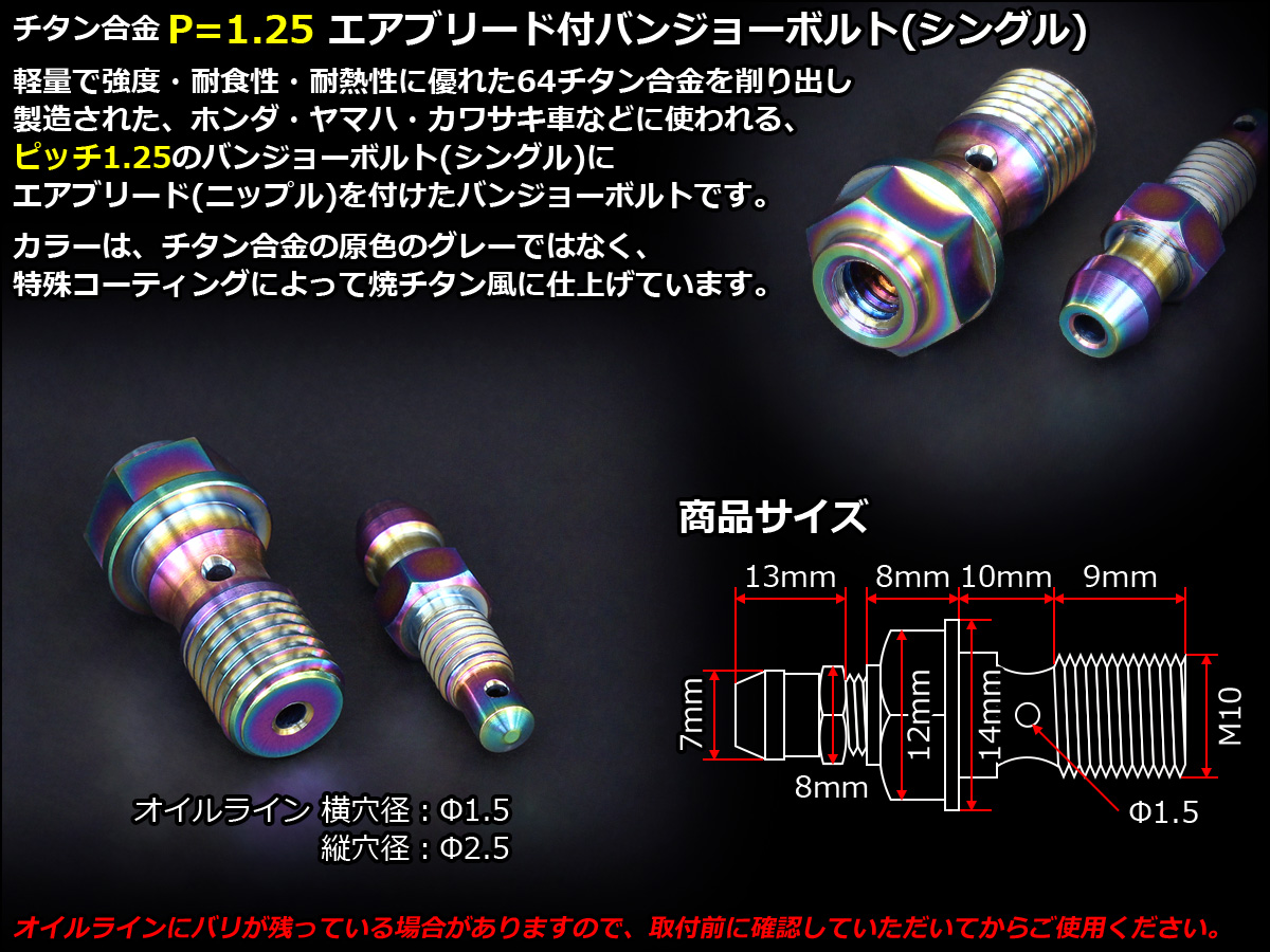 軽量で耐食性・耐熱性に優れた64チタン合金を削り出し製造された、ホンダ・ヤマハ・カワサキ車などに使われる、ピッチ1.25のバンジョーボルト(シングル)にエアブリード(ニップル)を付けたバンジョーボルトです。
