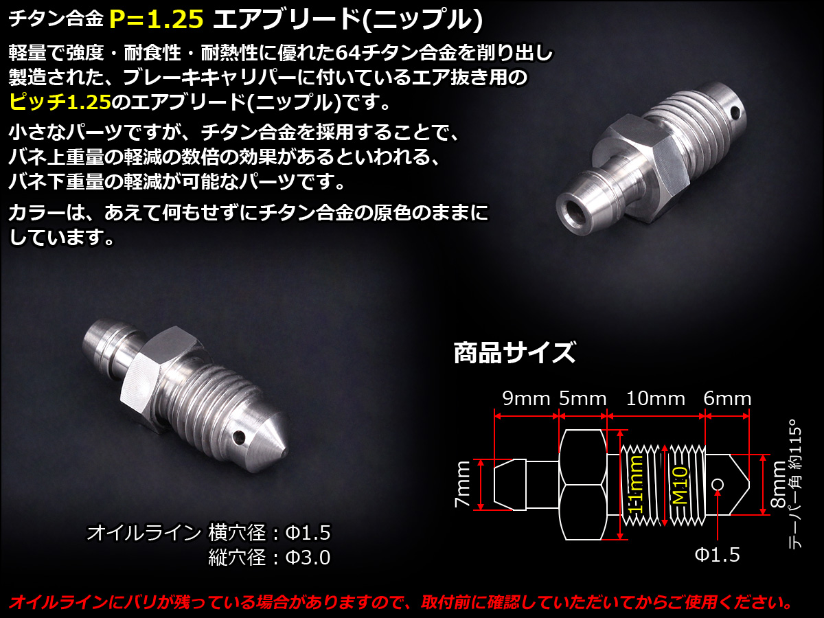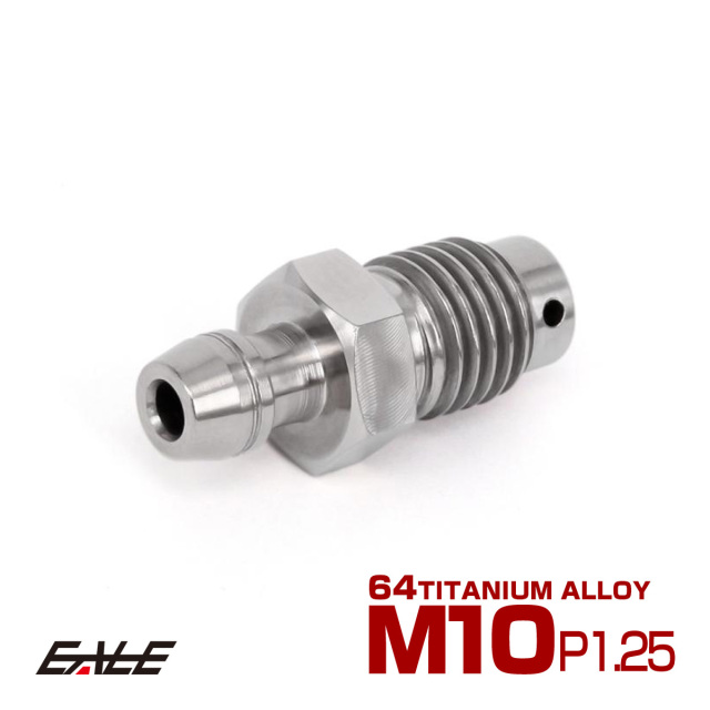 軽量で耐食性・耐熱性に優れた64チタン合金を削り出し製造された、ブレーキキャリパーに付いているエア抜き用のピッチ1.25のエアブリード(ニップル)です。