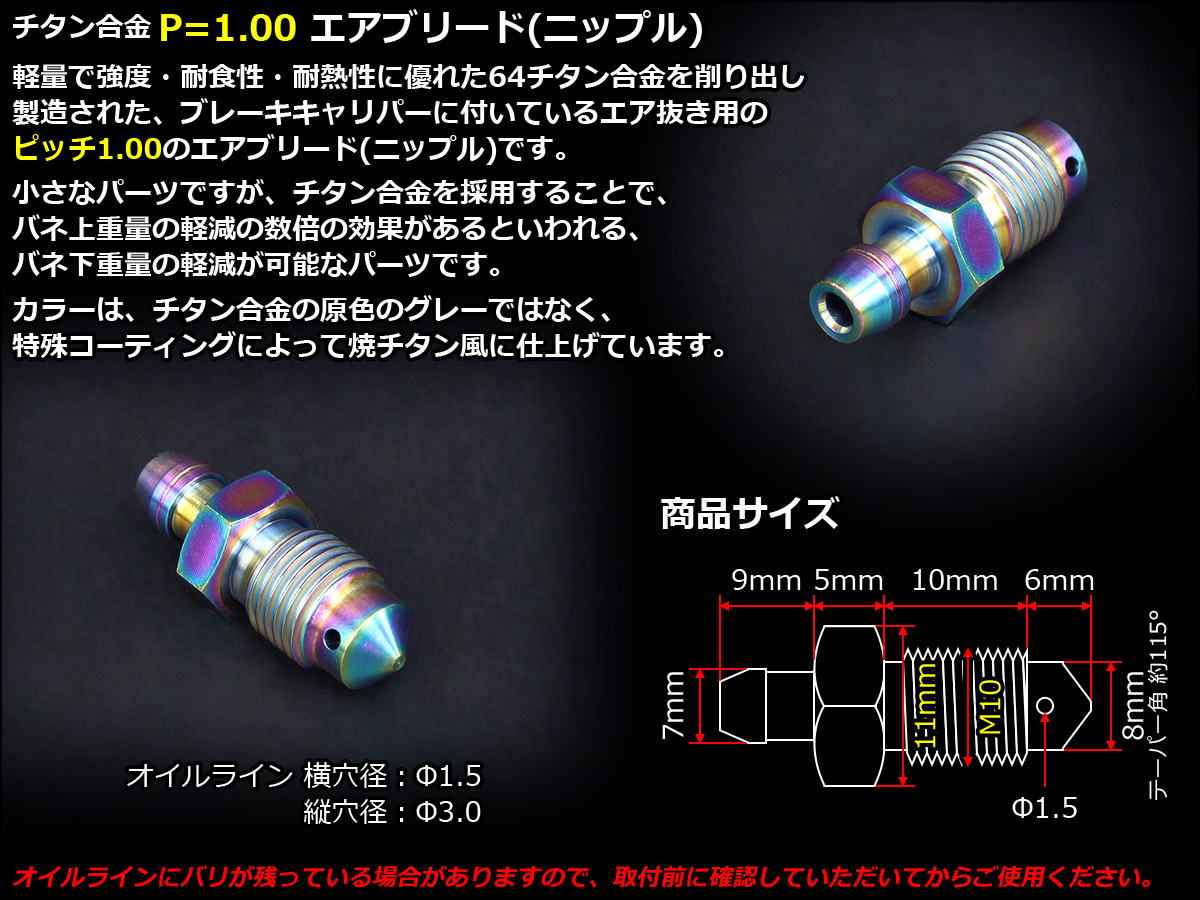 軽量で耐食性・耐熱性に優れた64チタン合金を削り出し製造された、ブレーキキャリパーに付いているエア抜き用のピッチ1.00のエアブリード(ニップル)です。