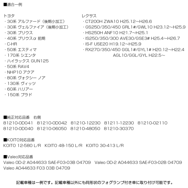 | ■適合車種 トヨタ用 ・30系 アルファード(後期小加工) ・30系 ヴェルファイア(後期小加工) ・30系 プリウス ・40系 プリウスα 前期 ・C-HR ・50系 エスティマ ・170系 シエンタ ・ハイラックス GUN125 ・50系 RAV4 ・NHP10 アクア ・80系 ヴォクシー ノア ・130系 ヴィッツ ・60系 ハリアー ・150系 プラド レクサス用 ・CT200H ZWA10 H25.12〜H26.6 ・GS250/350/450 GRL1#/GWL10 H23.12〜H25.9 ・HS250H ANF10 H21.7〜H25.1 ・IS250/350/300 AVE30/GSE3# H25.4〜H26.7 ・IS-F USE20 H19.12〜H25.9 ・RX270/350/450 GGL1#/GYL1# H20.12〜H22.4 AGL10/GGL/GYL H22.5〜 純正対応品番 右側 81210-0D041 81210-0D042 81210-12230 81211-12230 81210-02110 81210-0D040 81210-06050 81210-48050 81210-30370 ■KOITO用対応品番 KOITO 12-580 L/R KOITO 48-150 L/R KOITO 30-413 L/R ■Valeo用対応品番 Valeo 0D-2 A044633 SAE-F03-03B 04709 Valeo 0D-2 A044633 SAE-F03-02B 04709 Valeo A044633 F03 03B 04709 |