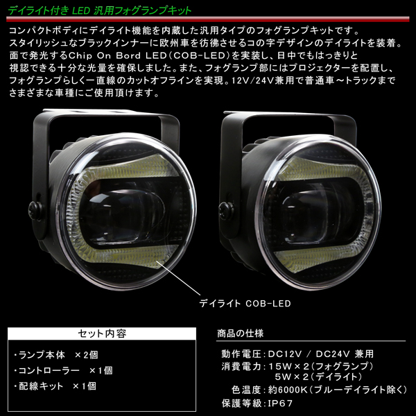コンパクトボディにデイライト機能を内蔵した汎用タイプのフォグランプキットです。 スタイリッシュなブラックインナーに欧州車を彷彿させるコの字デザインのデイライトを装着。 面で発光するChip On Bord LED(COB-LED)を実装し、日中でもはっきりと 視認できる十分な光量を確保しました。また、フォグランプ部にはプロジェクターを配置し、 フォグランプらしく一直線のカットオフラインを実現。12V/24V兼用で普通車〜トラックまでさまざまな車種にご使用頂けます。