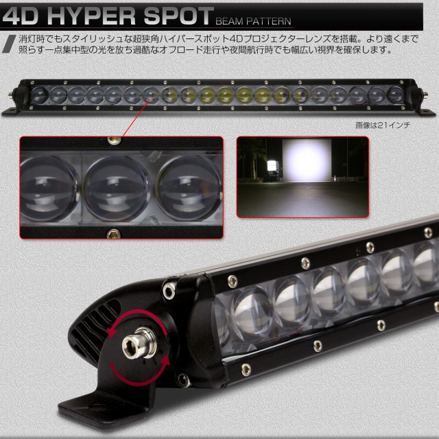 消灯時でもスタイリッシュな超狭角ハイパースポット4Dプロジェクターレンズを搭載。より遠くまで 照らす一点集中型の光を放ち過酷なオフロード走行や夜間航行時でも幅広い視界を確保します。