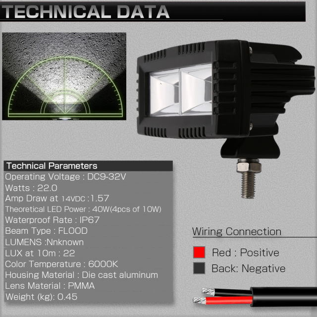 作業灯や自動車のバックランプ、オフロード車のドライビングライトにお勧めです。