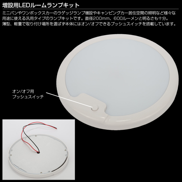 直径200mm、600ルーメンと明るさも十分。薄型、軽量で取り付け場所を選ばず本体にはオン/オフできるプッシュスイッチを搭載しています。