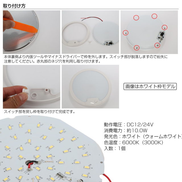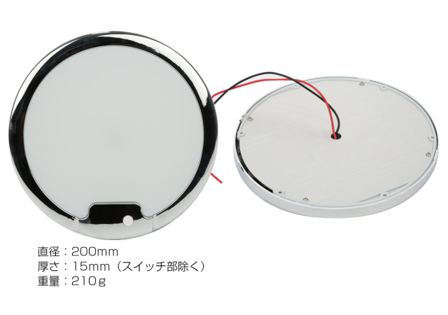直径200mm、600ルーメンと明るさも十分。薄型、軽量で取り付け場所を選ばず本体にはオン/オフできるプッシュスイッチを搭載しています。