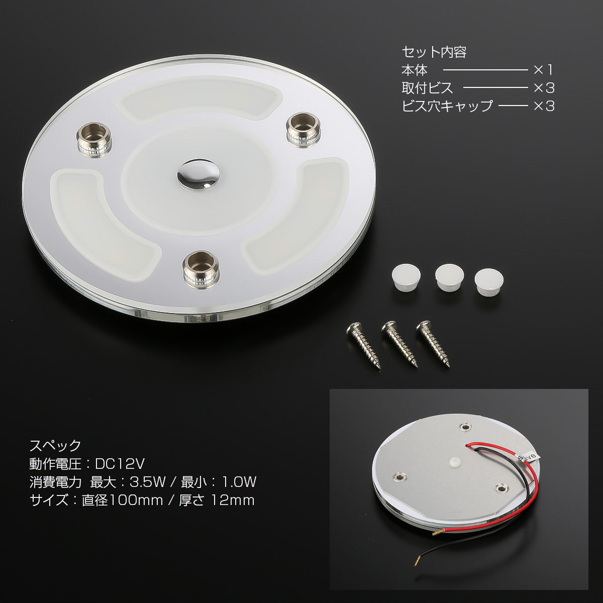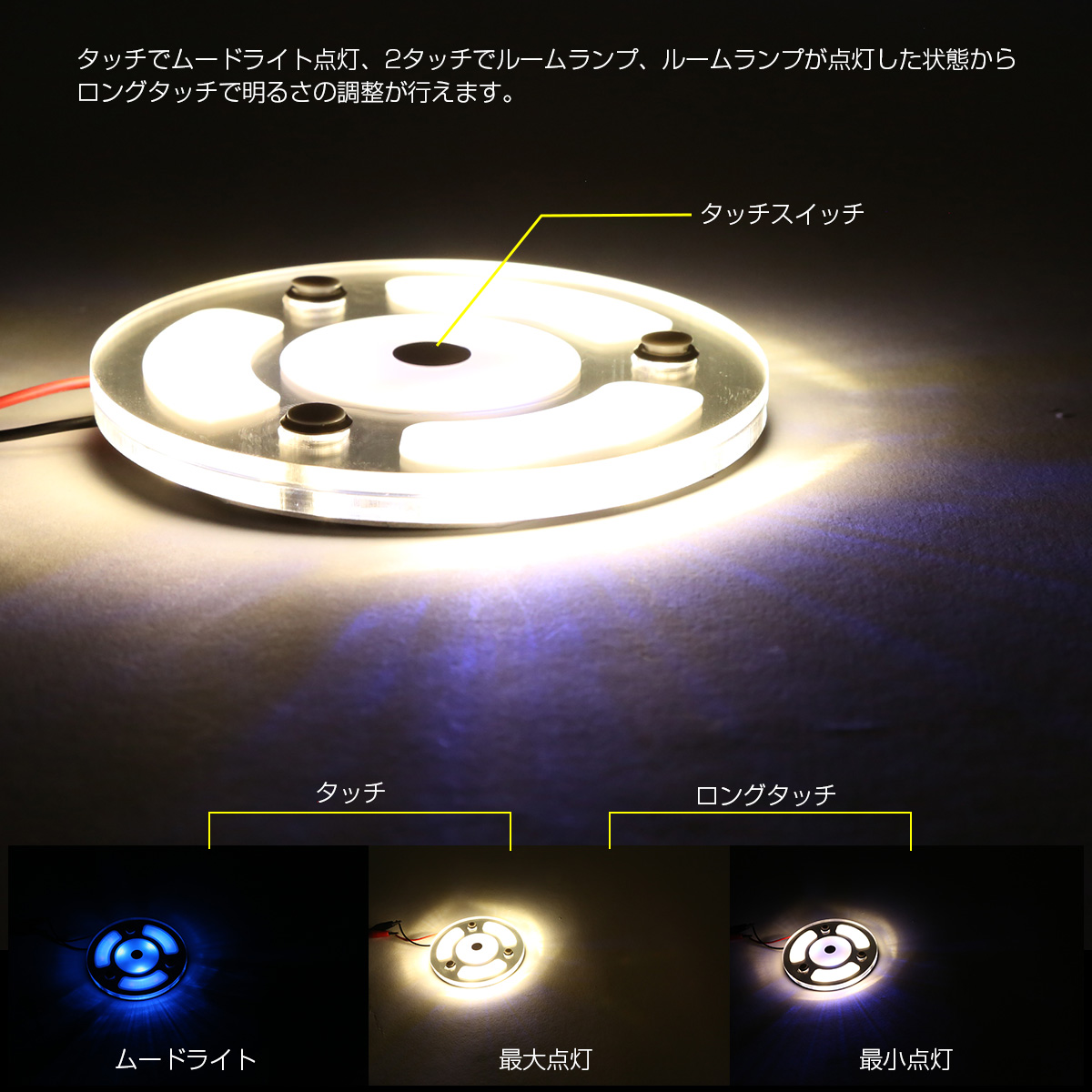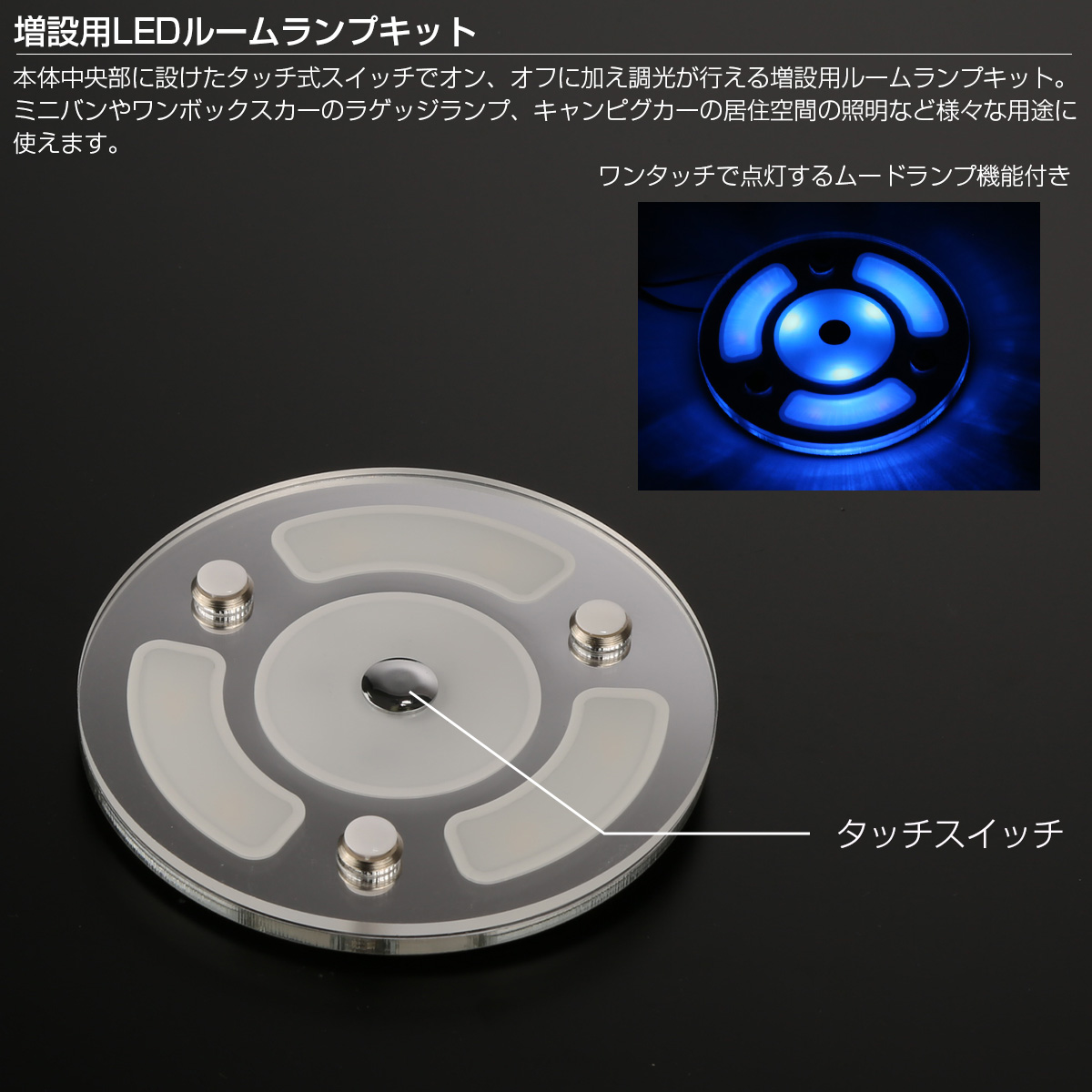 本体中央部に設けたタッチ式スイッチでオン、オフに加え調光が行える増設用ルームランプキット。