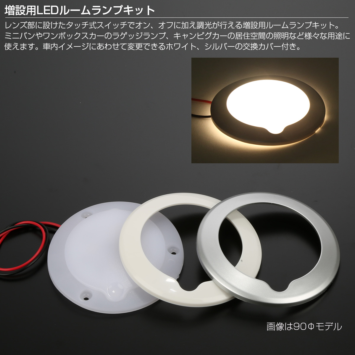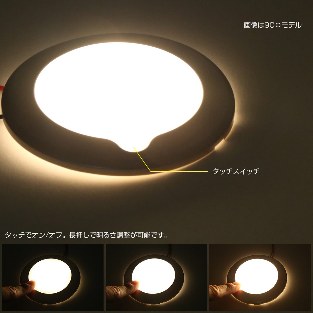レンズ部に設けたタッチ式スイッチでオン、オフに加え調光が行える増設用ルームランプキット。