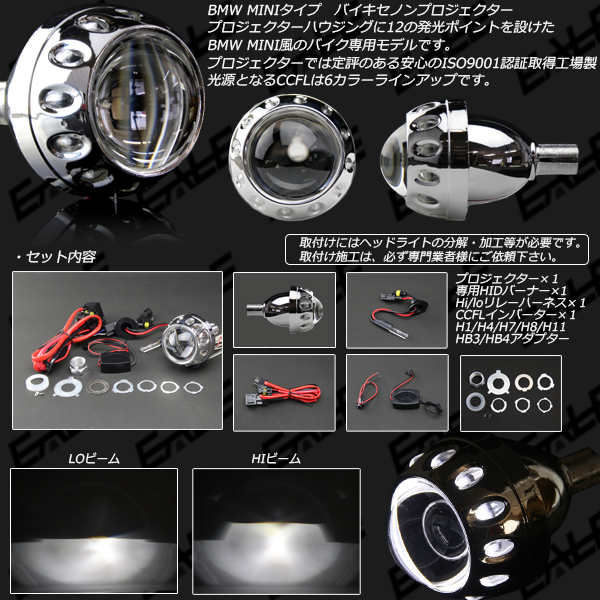 プロジェクターハウジングに12の発光ポイントを設けたBMW MINI風のバイク専用モデルです。