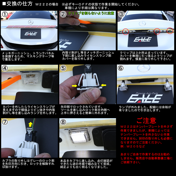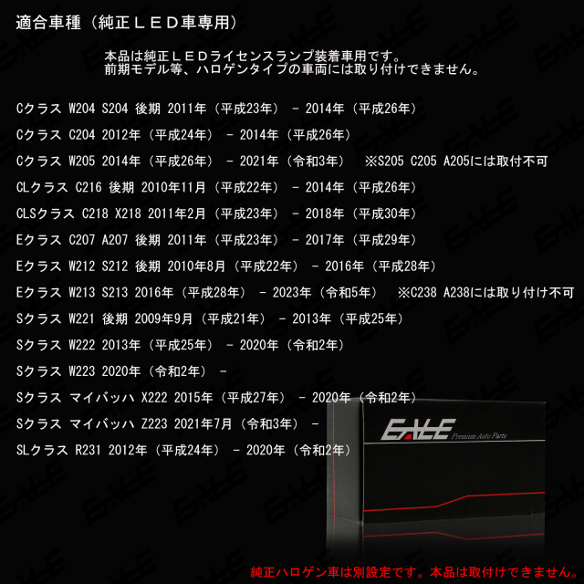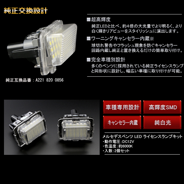 多くのベンツに採用されている純正ライセンスランプと同形状に設計し、幅広い車種に取り付けが可能です。