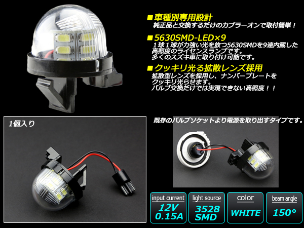 高輝度の5630SMDを9基内蔵し、純正ランプやバルブ交換等と比べ、ナンバー廻りを明るく照らします。