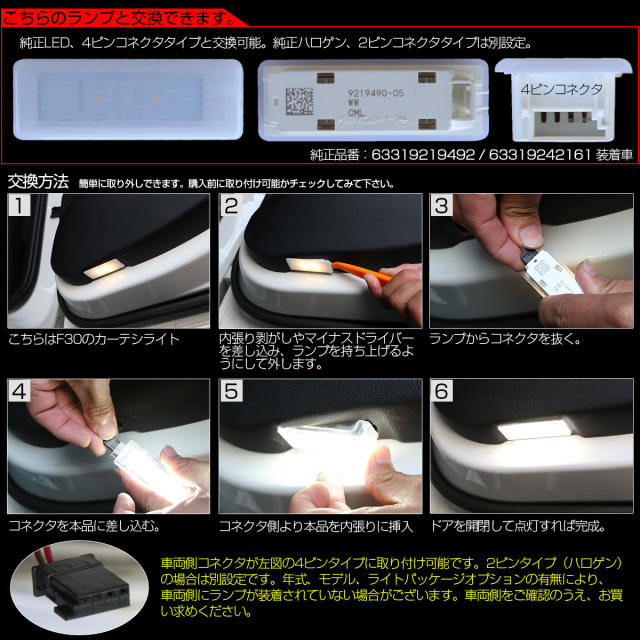| ■適合車種 1シリーズ F20 / F21 カーテシランプ・フットランプ 2シリーズ F22 / F23 / F45 / F46 カーテシランプ・フットランプ 3シリーズ F30 / F34 カーテシランプ・フットランプ F31 カーテシランプ・フットランプ・ラゲッジランプ 4シリーズ F32 / F33 / F36 / F82 カーテシランプ・フットランプ 5シリーズ(後期) F07 / F10 / F11 フットランプ 7シリーズ(後期) F01 / F02 / F03 フットランプ X1シリーズ E84 フットランプ X3シリーズ F25 フットランプ X4シリーズ F26 フットランプ Iシリーズ I01 フットランプ・グローブボックスランプ・ラゲッジランプ |