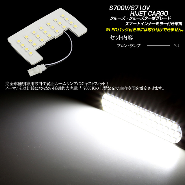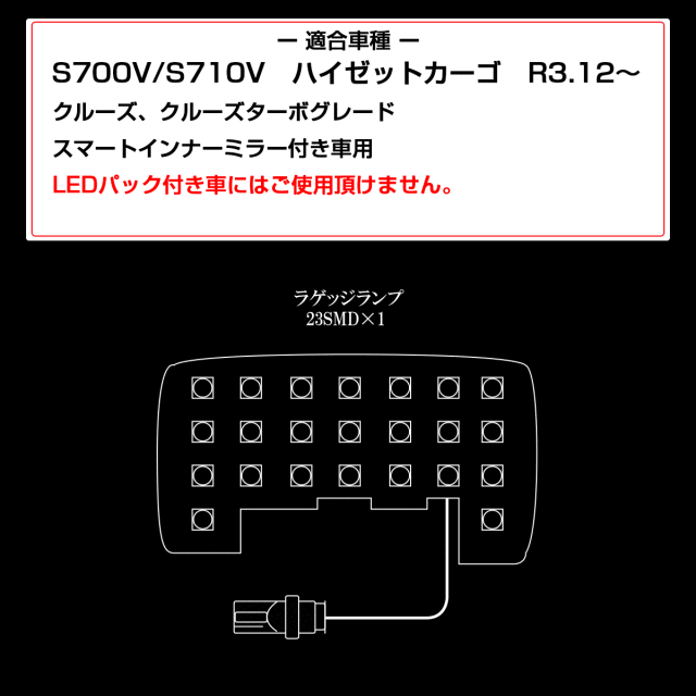 | ■適合車種(型式:S700V/S710V) DAIHATSU ダイハツ ハイゼットカーゴ R3.12〜 クルーズ&クルーズターボグレード スマートインナーミラー付き車用 ※クルーズ、クルーズターボ以外のグレード、スマートインナーミラー無し車、LEDパック付き車には取り付けできません。 |