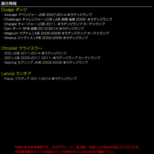 | ■適合車種 Dodge ダッジ ・Avenger アベンジャー JS系 2007-2014 ※ラゲッジランプ ・Challenger チャレンジャー LC系 LA系 前期 後期 2008- ※ラゲッジランプ ・Charger チャージャー LD系 2011- ※ラゲッジランプ カーテシランプ ・Dart ダート RF系 前期 2012-2014 ※ラゲッジランプ ・Magnum マグナム LX系 2005-2008 ※ラゲッジランプ カーテシランプ ・Stratus ストラトス LR系 2002-2006 ※ラゲッジランプ Chrysler クライスラー ・200 JS系 2011-2014 ※ラゲッジランプ ・300 LX系 2005-2011 2011- ※ラゲッジランプ カーテシランプ ・Sebring セブリング JR系 2002-2006 ※ラゲッジランプ Lancia ランチア ・Flavia フラヴィア 2011-2014 ※ラゲッジランプ ※適合表は参考情報です。年式やグレード、販売国、地域により異なる場合がございます。 ※記載車種であっても同型のランプが使われているか必ずご確認下さい。 |