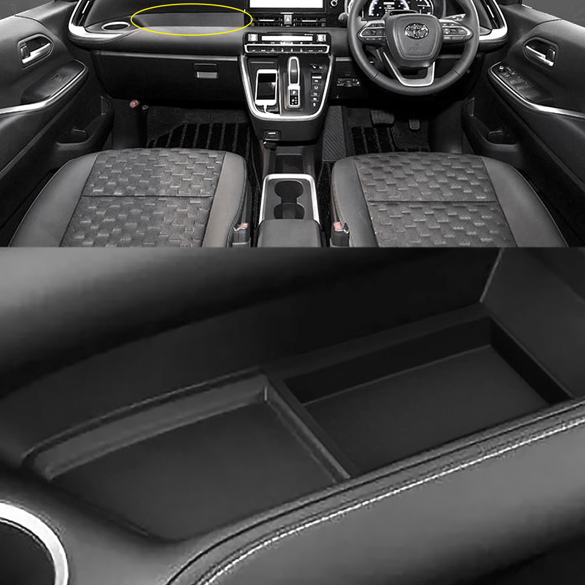 助手席にあるオープントレイに設置し右側だけ深い小物入れをフラットに出来る便利な嵩上げインナートレイ。