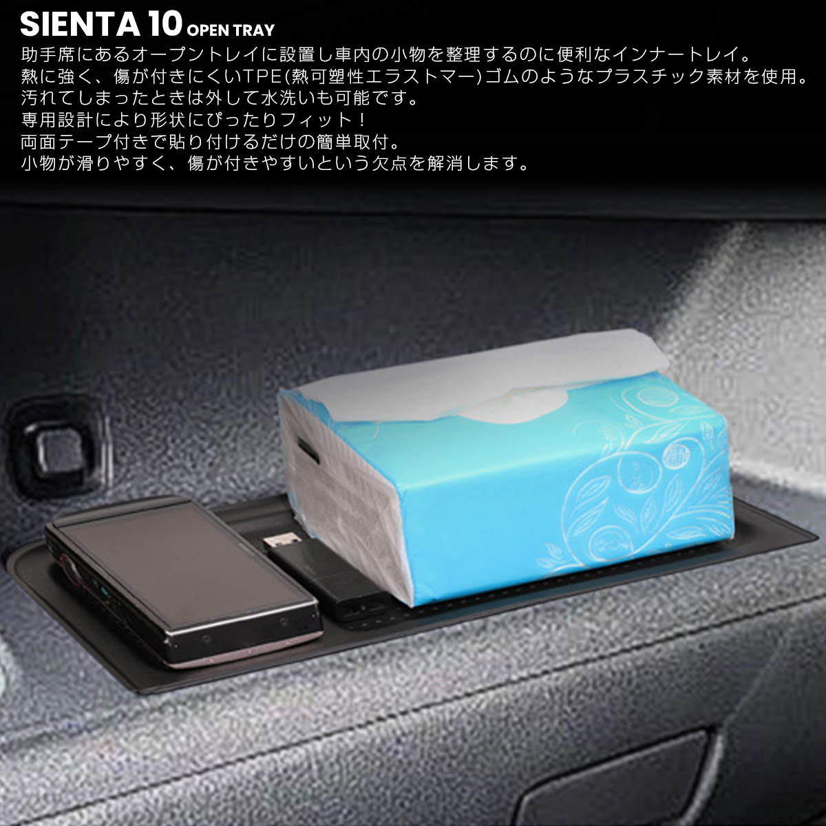 助手席にあるオープントレイに設置し車内の小物を整理するのに便利なインナートレイ。