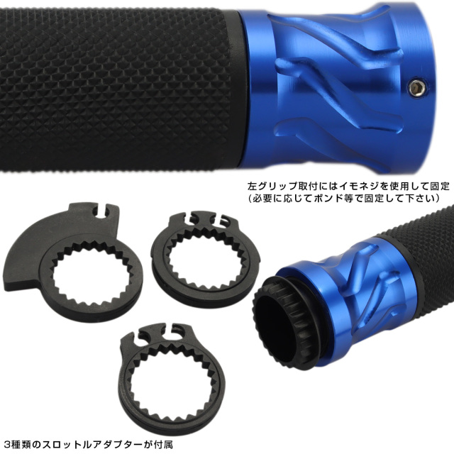 スロットルアダプターが付属され、一般的な22.2mmのハンドルバーに使えるので、ほとんどのバイクに取付可能です。