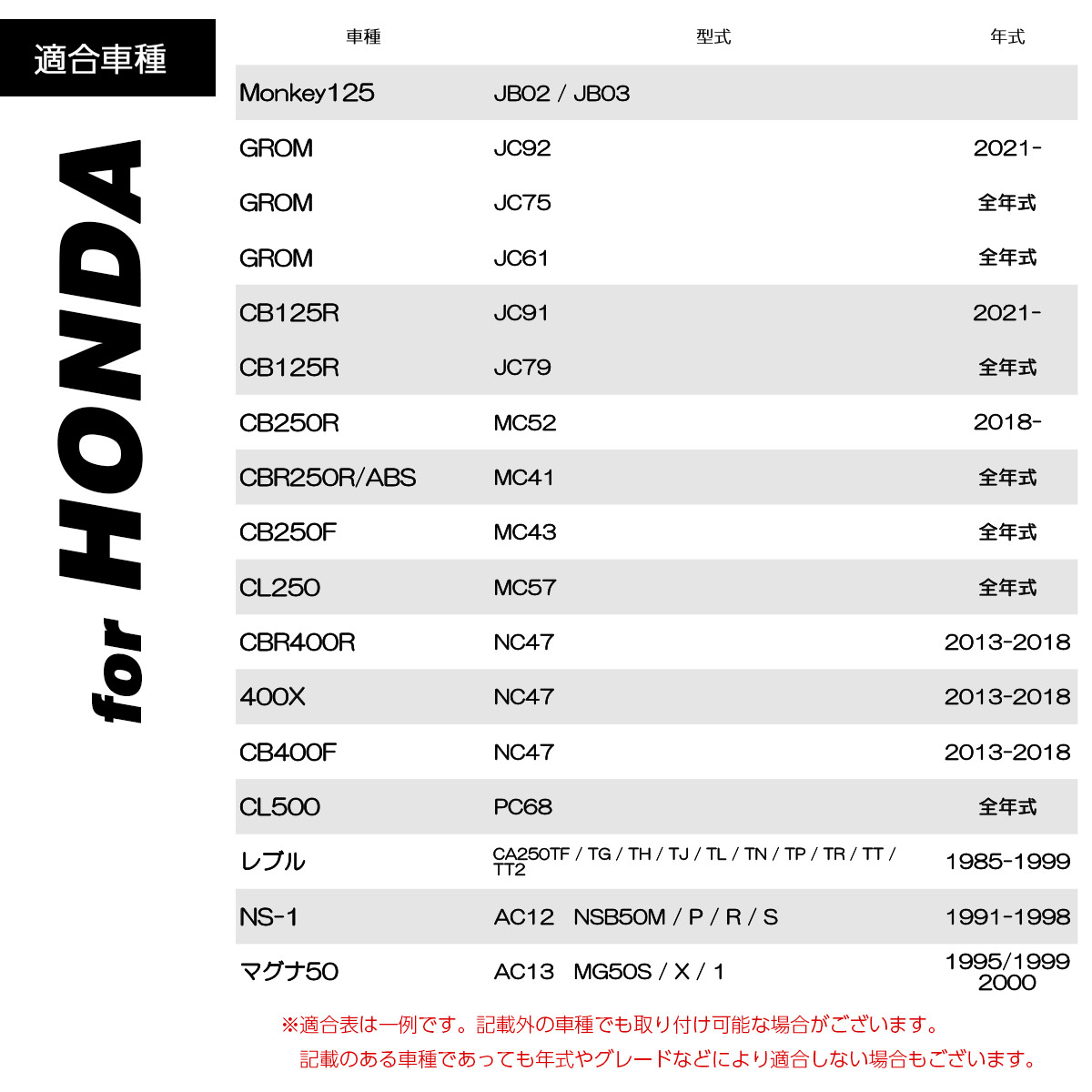 | ■適合車種:ホンダ車用 Monkey125 JB02 / JB03 GROM JC92 2021- GROM JC75 全年式 GROM JC61 全年式 CB125R JC91 2021- CB125R JC79 全年式 CB250R MC52 2018- CBR250R/ABS MC41 全年式 CB250F MC43 全年式 CL250 MC57 全年式 CBR400R NC47 2013-2018 400X NC47 2013-2018 CB400F NC47 2013-2018 CL500 PC68 全年式 ※他適合については適合表をご覧ください。 |
