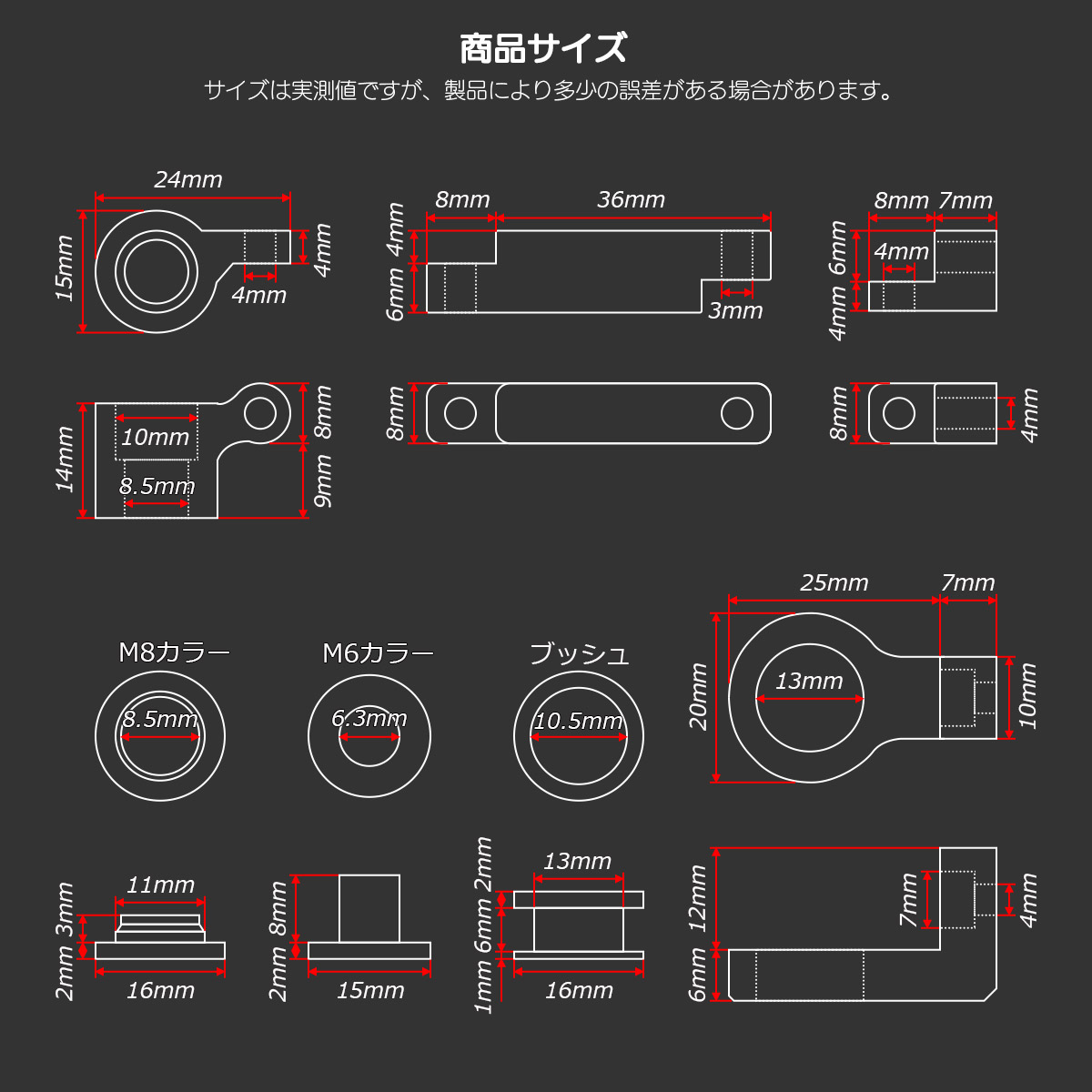| ■入数:数量1で1セット 【セット内容】 本体パーツ:4個 M4×10:3本 M8用カラー:2個 M6用カラー:1個 ブッシュ:1個 M6×15:1本 |