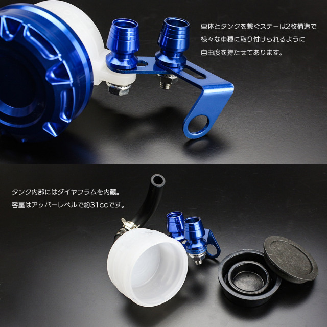 別体リザーバータンクを交換することで、愛車のドレスアップを可能にするアルミ製カラーキャップ マスターシリンダーリザーバータンク。