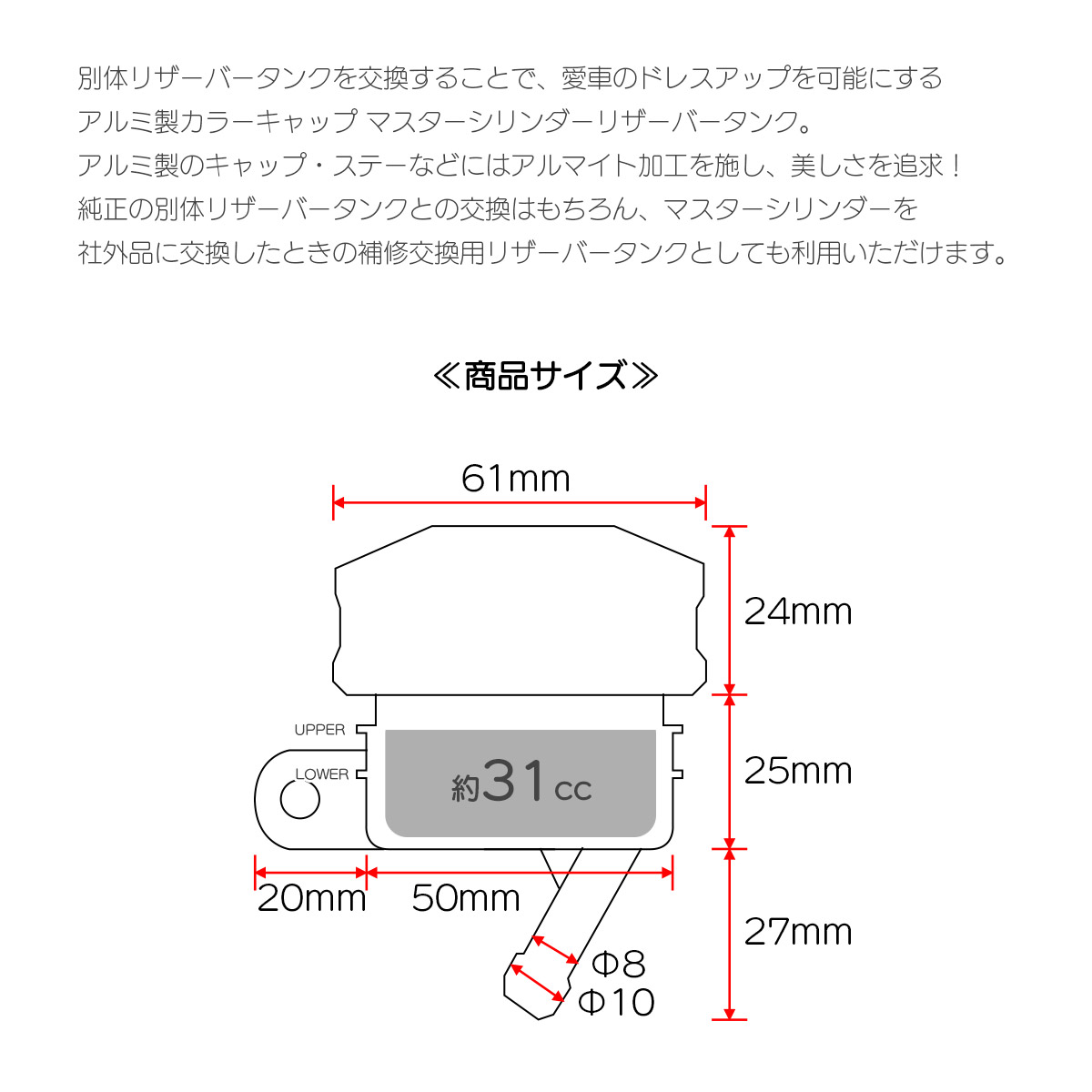 純正の別体リザーバータンクとの交換はもちろん、マスターシリンダーを社外品に交換したときの交換補修用リザーバータンクとしても利用いただけます。