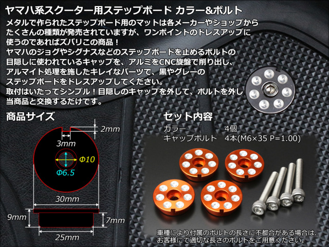 | ■適合車種:ジョグやシグナスなどのステップボードの取付ボルトに目隠しのキャップが付いているヤマハ系スクーター |