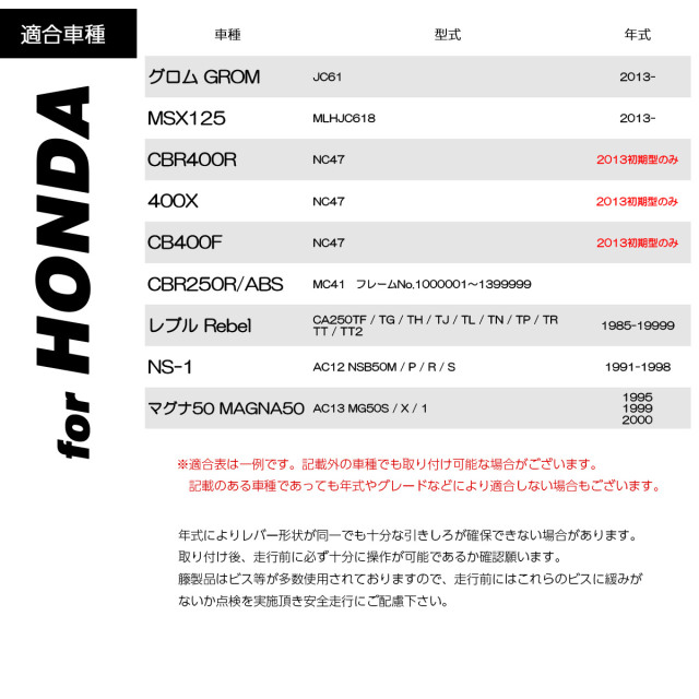 | ※レバー交換はバイクショップ様など専門技術を持った方に交換依頼を行ってください。 ※適合車種であってもグレード・年式・マスターシリンダーの形状等により適合しない場合があります。 ※当製品は多数ボルトやパーツを使用しているため、遊び(ガタ)がある場合があります。また走行前にボルト等の緩みなどを点検していただき、緩みなどがある場合は必ず増し締めを行ってください。 |
