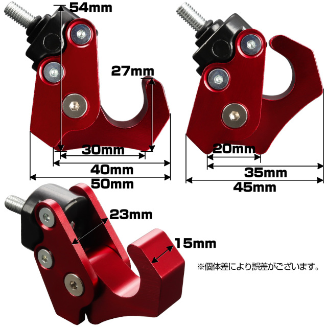 アルミビレットから削り出されたパーツにアルマイト処理を施した、しっかりとした作りで重厚感のある可倒式コンビニフックです。
