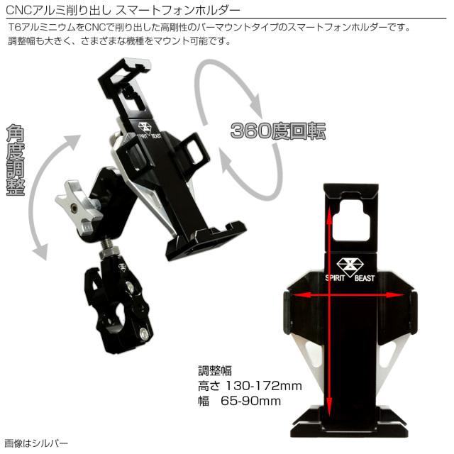 T6アルミニウムをCNCで削り出した高剛性のバーマウントタイプのスマートフォンホルダー。