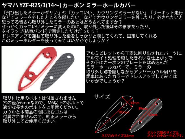 | ※YZF-R25他用で販売しておりますが、取付ボルトの中心間が52mmで、商品サイズの31mm×106mm 厚さ8mmのスペースがあれば他のバイクにも取付可能です。 |