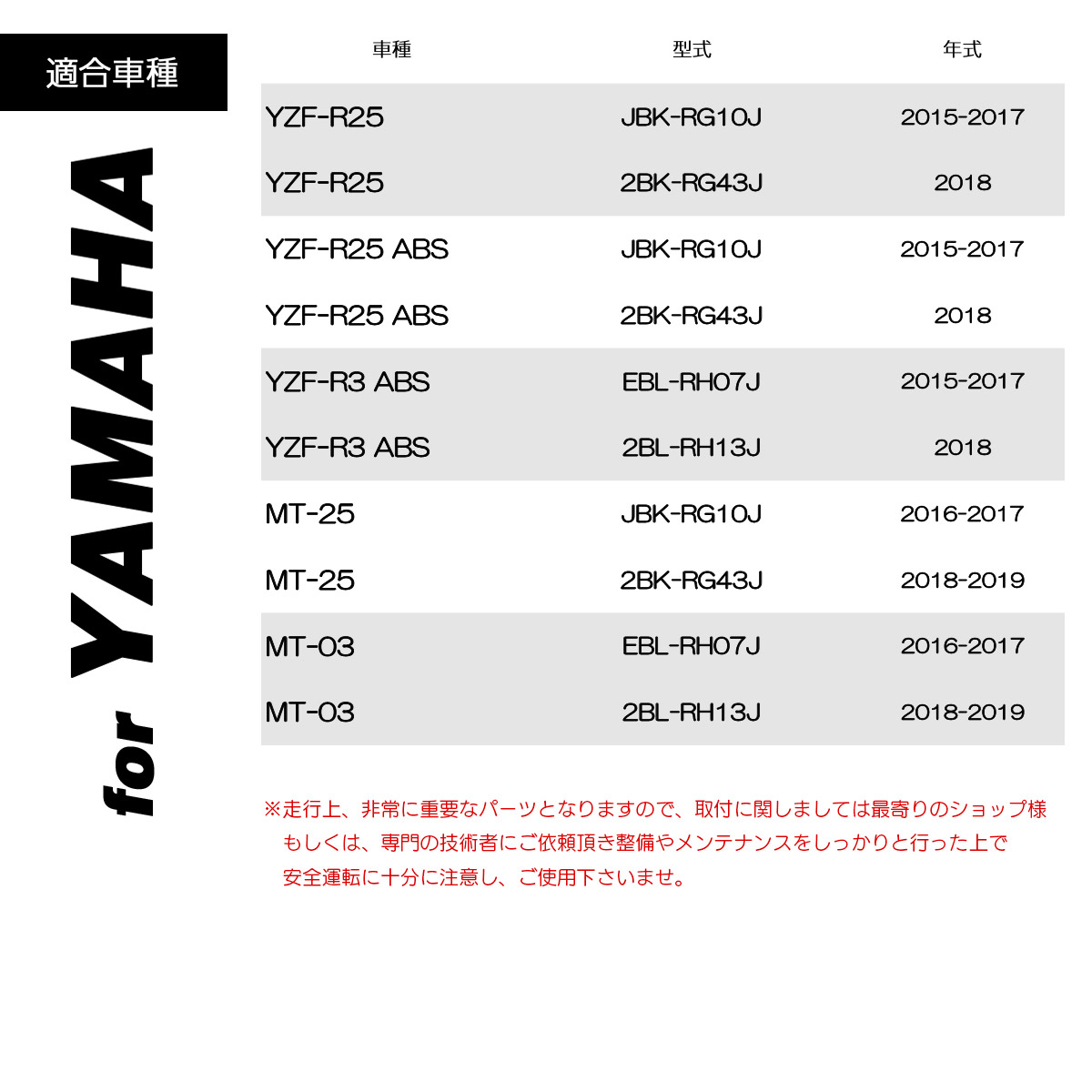 | ■適合車種 車種/型式/年式 YZF-R25 / JBK-RG10J / 2015-2017 YZF-R25 / 2BK-RG43J / 2018 YZF-R25 ABS / JBK-RG10J / 2015-2017 YZF-R25 ABS / 2BK-RG43J / 2018 YZF-R3 ABS / EBL-RH07J / 2015-2017 YZF-R3 ABS / 2BL-RH13J / 2018 MT-25 / JBK-RG10J / 2016-2017 MT-25 / 2BK-RG43J / 2018-2019 MT-03 / EBL-RH07J / 2016-2017 MT-03 / 2BL-RH13J / 2018-2019 |