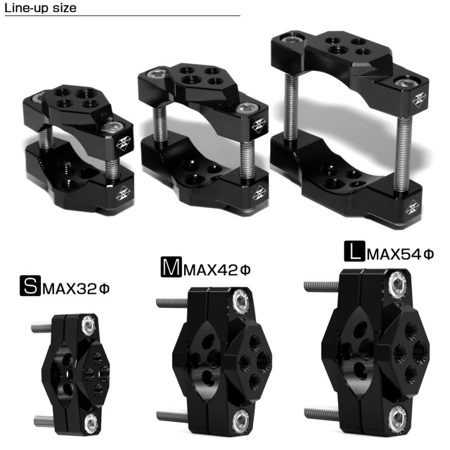 フォークパイプやフレーム、ハンドルバーなどのパイプ部に取り付けできる汎用ブラケット。