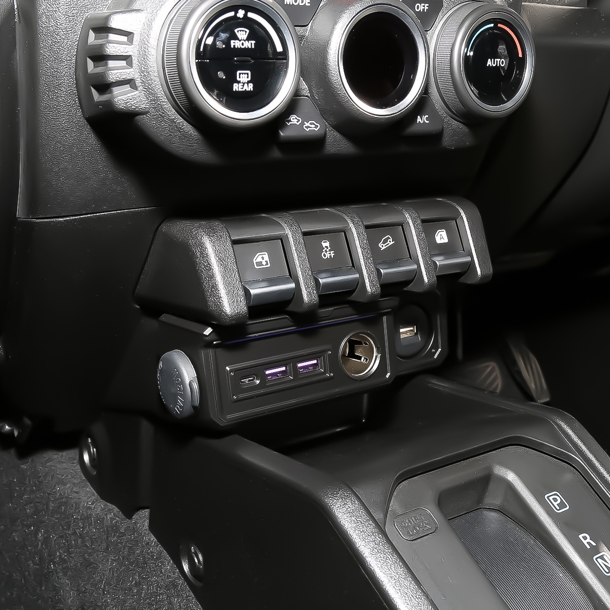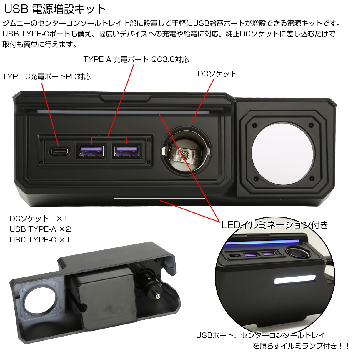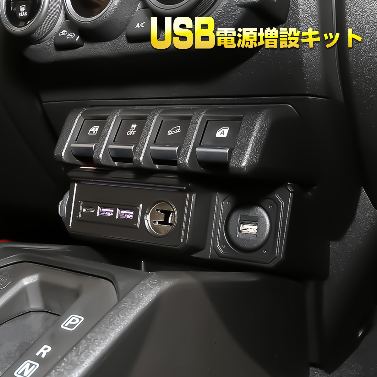 センターコンソールトレイ上部に設置して手軽にUSB給電ポートが増設できる電源キットです。