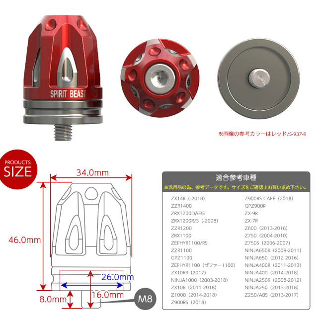 | ■適合:下記適合車種は参考データです。 ※適合を保証するものではございませんのでサイズをご確認の上お買い求め下さい。 ZX14R(-2018) / ZZR1400 / ZRX1200DAEG / ZRX1200R/S(-2008) ZZR1200 / ZRX1100 / ZEPHYR1100/RS / ZZR1100 / GPZ1100 ZEPHYR1100(ゼファー1100) / ZX10RR(2017) / NINJA1000(2003-2018) ZX10R(2011-2018) / Z1000(2014-2018) / Z900RS(2018) Z900RS CAFE(2018) / GPZ900R / ZX-9R / ZX-7R Z800(2013-2016) / Z750(2004-2010) / Z750S(2006-2007) NINJA650R(2009-2011) / NINJA650(2012-2016) / NINJA400R(2011-2013) NINJA400(2014-2018) / NINJA250R(2008-2012) / NINJA250(2013-2018) Z250/ABS(2013-2017) |