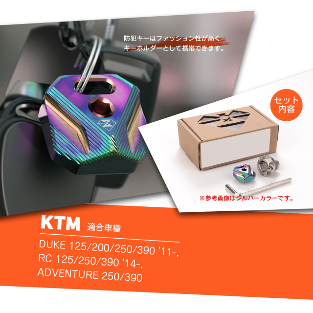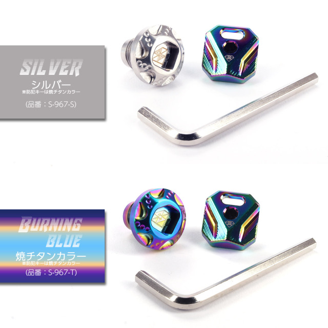 | ※セキュリティキーのカラーは焼チタンカラーのみとなります。 ※本品取付車両を運転される前にはパーツの各部に緩みやガタツキがないか等、安全点検を実施の上ご使用下さい。 |