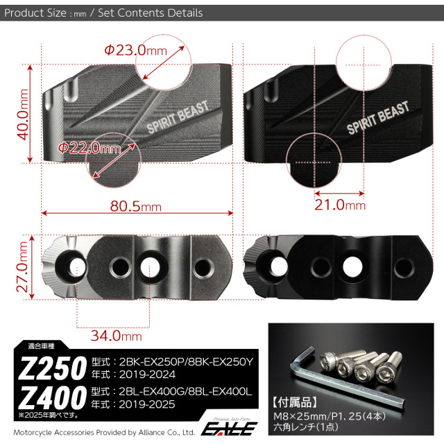 | ■適合 【Z250】 型式:2BK-EX250P 年式:2019-2022年 型式:8BK-EX250Y 年式:2023-2024年 【Z400】 型式:2BL-EX400G 年式:2019-2022年 型式:8BL-EX400L 年式:2023-2025年 ※2025年調べです。 |