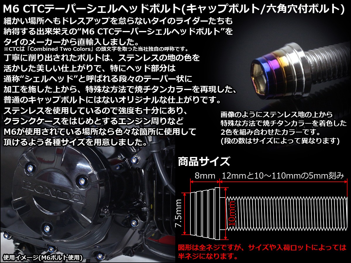 細かな場所へもドレスアップを怠らないタイのライダーたちも納得する出来栄えのM6 CTCテーパーシェルヘッドボルトをタイのメーカーから直輸入しました。