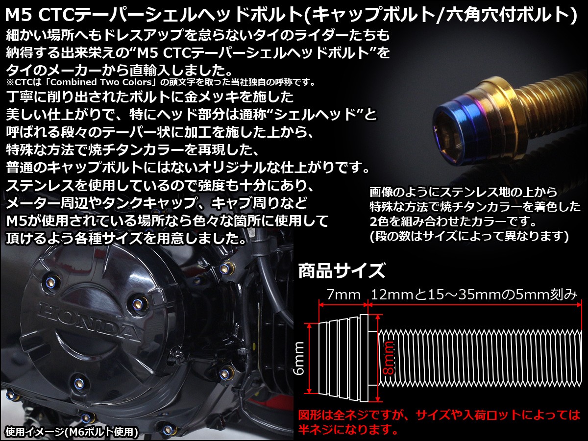 細かな場所へもドレスアップを怠らないタイのライダーたちも納得する出来栄えのM5 CTCテーパーシェルヘッドボルトをタイのメーカーから直輸入しました。