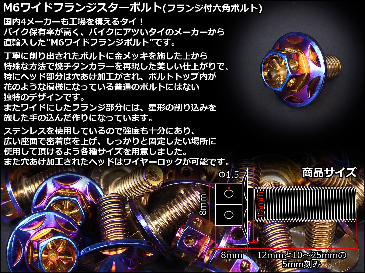 丁寧に削り出されたボルトに金メッキを施した上から特殊な方法で焼チタンカラーを再現した美しい仕上がりで、特にヘッド部分は穴あけ加工がされ、ボルトトップ内が花のような模様になっている普通のボルトにはない独特のデザインです。
