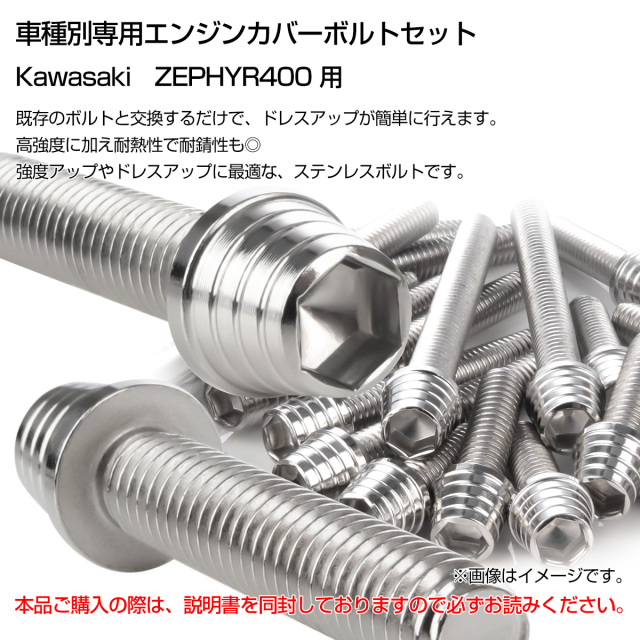 ■適合車種 車種名:ZEPHYR400 年式:1989年〜1994年 型式:ZR400-C1〜C6 ※1995年式 ZR400-C7は、別出品のZEPHYR400χのボルトセットをお買い求めください。 |