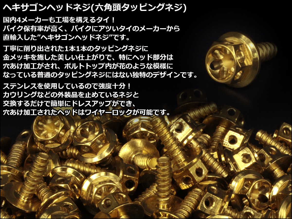 M4×16mm ヘキサゴンヘッドネジ タッピングネジ ステンレス 削り出し 六角頭 フランジ カウルやパネルなどに ゴールド TC0007 【メール便可】